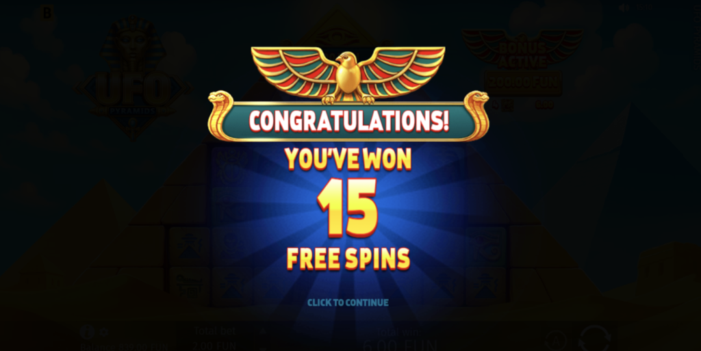Para aquellos impacientes por experimentar la acción de los giros gratis y los multiplicadores acumulados, UFO Pyramids ofrece una opción de compra de bono (Buy Bonus) . Por un costo de 100 veces tu apuesta, puedes saltarte el juego base y acceder directamente a la emocionante ronda de giros gratis. Esta función es ideal para jugadores que buscan maximizar su tiempo de juego y dirigirse directamente a las características más lucrativas del juego.