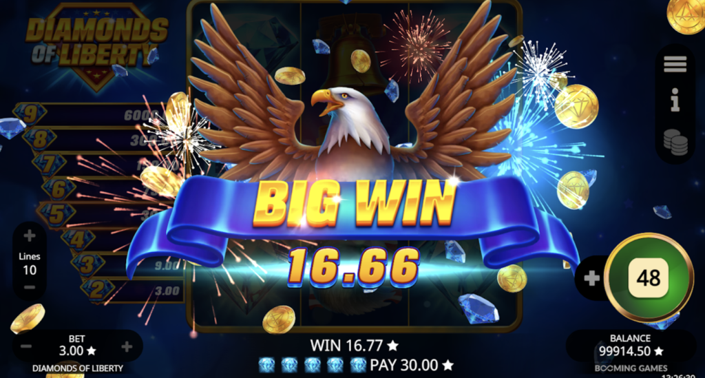 Booming Games ha creado una tragamonedas que captura la esencia del espíritu americano con un diseño vibrante y símbolos icónicos. La Diamonds of Liberty slot te transporta a un escenario cargado de orgullo nacional, adornado con estrellas, rayas y, por supuesto, diamantes relucientes que prometen fortuna en cada giro .