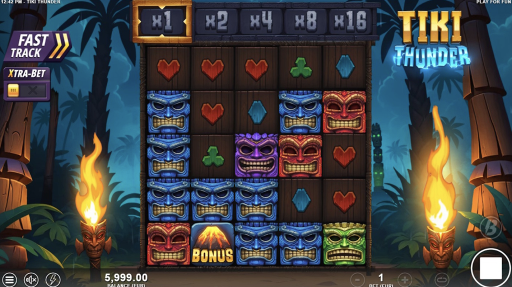 Tiki Thunder no es un slot cualquiera. Se desmarca con un diseño de cuadrícula de 5×5 tambores, un formato que permite una gran cantidad de combinaciones ganadoras y una experiencia de juego dinámica. La mecánica central que impulsa la emoción es el Cluster Pays, un sistema revolucionario donde las ganancias no se basan en líneas de pago fijas, sino en la formación de grupos de símbolos idénticos adyacentes . Cuando logras crear un “cluster” de cinco o más símbolos iguales que se tocan horizontal o verticalmente, ¡boom!, desatas una victoria.