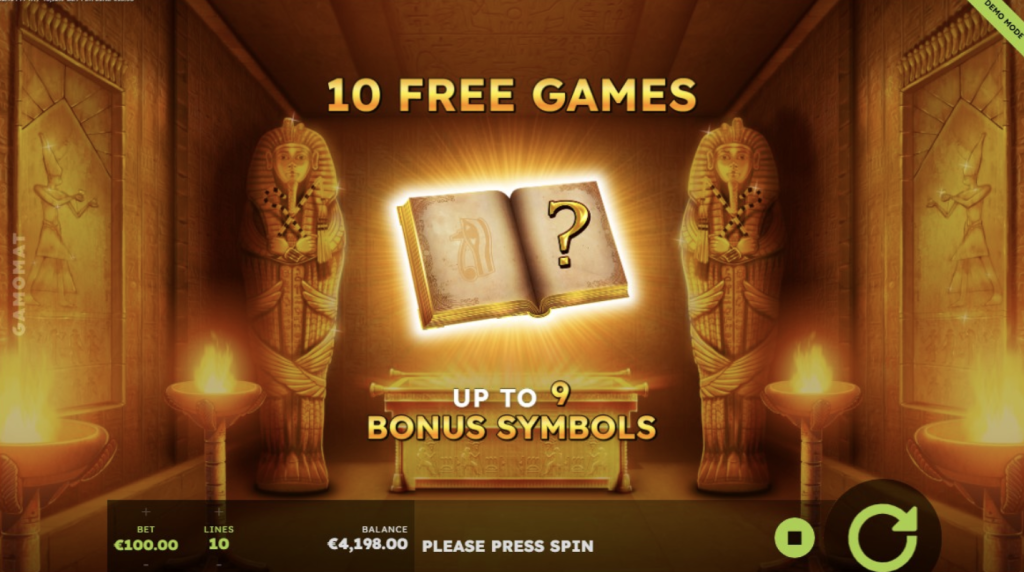 La verdadera magia de Legacy of Ramses Book ocurre cuando aterrizas tres, cuatro o cinco símbolos Scatter (Libros) en los carretes. Esto activa la bonificación de Juegos Gratis, otorgando inicialmente 10 giros .