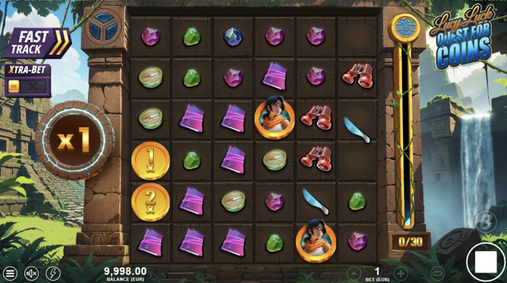 Olvídate de las líneas de pago tradicionales. Lucy Luck and the Quest for Coins utiliza una cuadrícula de 6 rodillos por 6 filas con una mecánica de pagos por clúster (Cluster Pays) . Esto significa que ganas al agrupar símbolos idénticos, lo que abre la puerta a múltiples victorias en una sola tirada gracias a las ganancias en cascada.