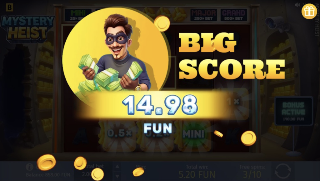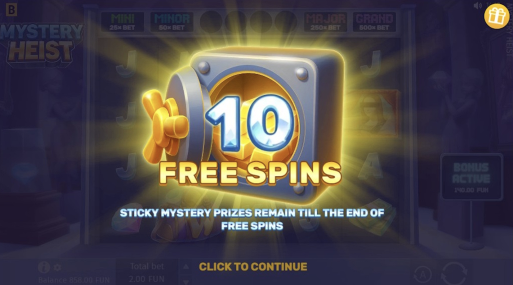 La emoción del Mystery Heist slot no termina con los premios fijos. BGaming ha integrado un modo de giros gratis que puede multiplicar tus ganancias y extender tu tiempo de juego de manera significativa.