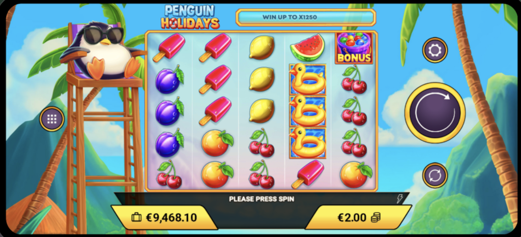 El juego transporta a los jugadores a un escenario idílico de playa de arena blanca y aguas cristalinas. El protagonista es un “compañero pingüino relajado” que te saluda desde el primer momento, estableciendo un tono divertido y desenfadado . A diferencia de las típicas tragamonedas de frutas clásicas, aquí las frutas giran en los carretes rodeadas de elementos vacacionales, creando una fusión perfecta entre lo clásico y lo moderno .