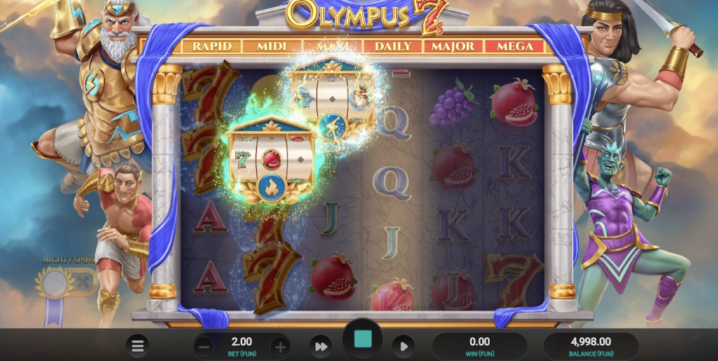 Además, tras una activación completa, puede dispararse un Olympus Respin, que tiene el potencial de reactivar todos los mini slots para una cascada de ganancias consecutivas.