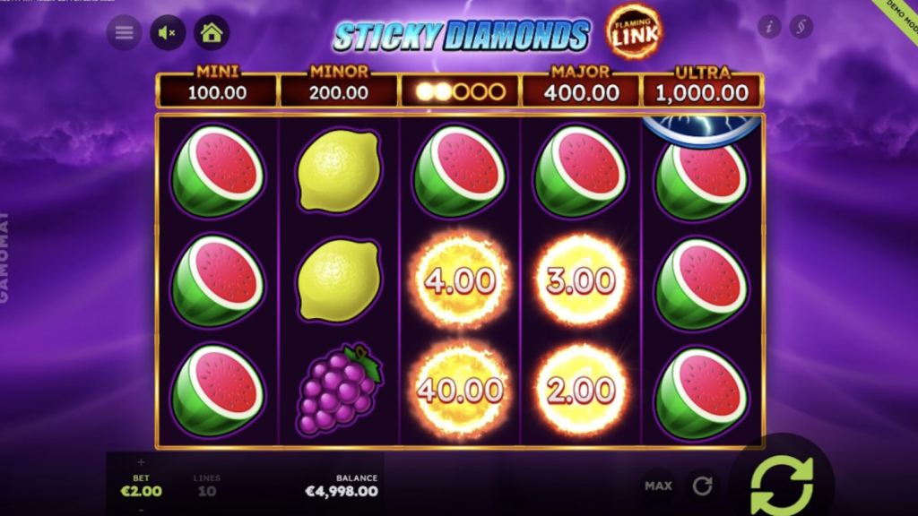 El juego base de Sticky Diamonds Flaming Link se mantiene fiel a las raíces de Gamomat. La estética es limpia y nítida, centrada en símbolos tradicionales como frutas, campanas y sietes, pero con un toque moderno y vibrante.